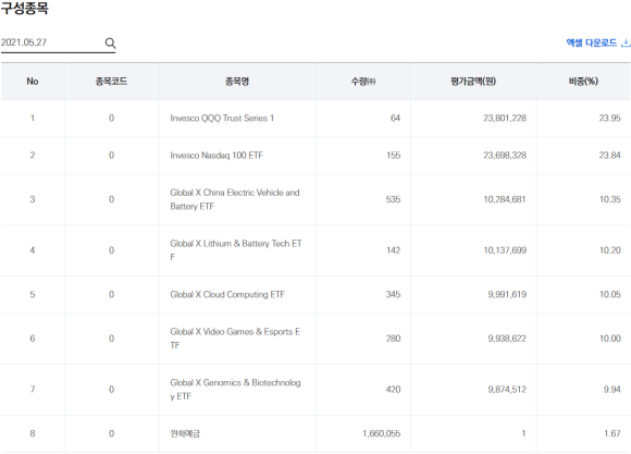 TIGER 글로벌BBIG액티브 ETF의 포트폴리오 구성 종목은 의아하게도 개별 종목이 아닌 본인들 글로벌 운용사 ETF들로만 구성을 해놨네요..?