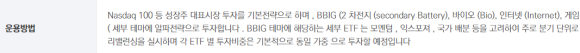 Nasdaq-100 등 성장주 대표시장 투자를 기본전략으로 하며, BBIG(2차전지(secondary Battery), 바이오(Bio), 인터넷(Internet), 게임(Game)) 세부 테마에 알파전략으로 투자합니다. BBIG 테마에 해당하는 세부 ETF는 모멘텀, 익스포져, 국가 배분 등을 고려하여 주로 분기 단위로 리밸런싱을 실시합니다.
