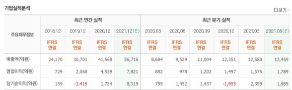 현재 연간 기준으로 봤을 때 2021년 매출액 6조 6,519억원 / 영업이익 1조 3,498억원인데 당기순이익이 무려 14조9,743억원으로 나오고 있습니다.