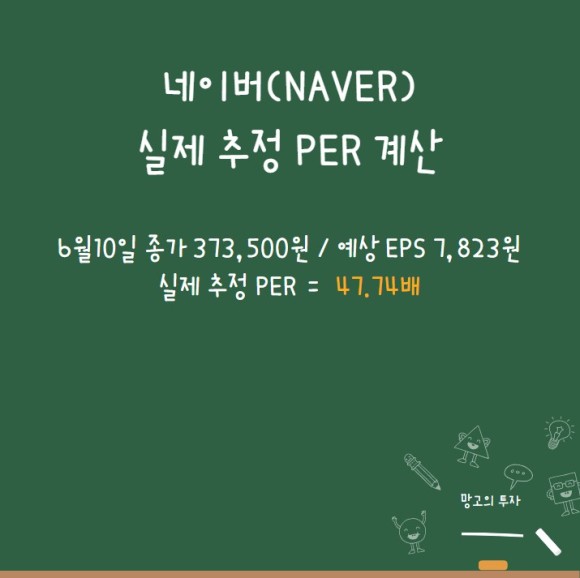 6월 10일 네이버(NAVER)의 종가 기준 373,500원 / 추정 EPS 7,823원을 하게되면 실제 추정 PER은 47.74배가 나오게 됩니다.