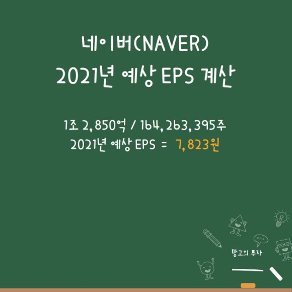 2021년 당기순이익인 1조 2,850억 / 총 발행 주식수 164,263,395주를 하게되면 2021년 추정(예상) EPS는 7,823원이 나옵니다.