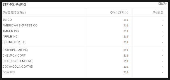 ETF 주요 구성 자산입니다 다우존스 30개 기업 모두 주식을 310주 보유 하고 있는게 특이한 점입니다.